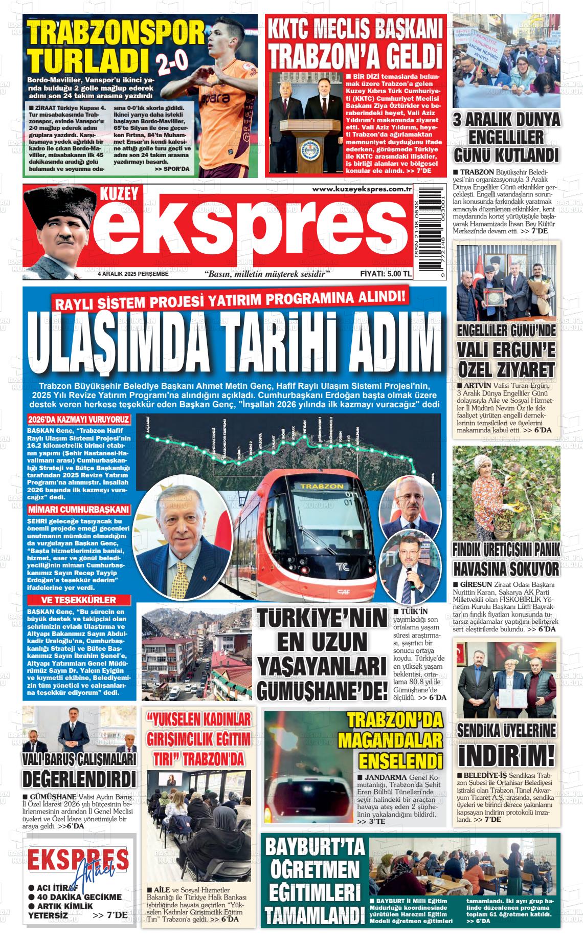 Trabzon Yerel Gazeteleri 04 Aralık 2025, Perşembe Günü Manşeti